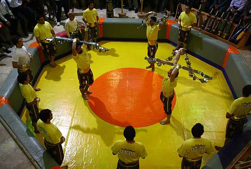 Pahlevani is an Iranian martial art that combines elements of Islam, Gnosticism and ancient Persian beliefs. It describes a ritual collection of gymnastic and callisthenic movements performed by ten to twenty men, each wielding instruments symbolizing ancient weapons. The ritual takes place in a Zoorkhane, a sacred domed structure with an octagonal sunken arena and audience seats. The Morshed (master) who leads the Pahlevani ritual performs epic and Gnostic poems and beats out time on a zarb goblet drum. The poems he recites transmit ethical and social teachings and constitute part of Zoorkhanei literature. Participants in the Pahlevani ritual may be drawn from any social strata or religious background, and each group has strong ties to its local community, working to assist those in need. During training, students are instructed in ethical and chivalrous values under the supervision of a Pīshkesvat (champion). Those who master the individual skills and arts, observe religious principles and pass ethical and moral stages of Gnosticism may acquire the prominent rank of Pahlevanī (hero), denoting rank and authority within the community. At present, there are 500 Zoorkhanes across Iran, each comprising practitioners, founders and a number of Pīshkesvats.