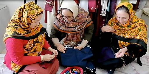 Turkmen-style needlework is a decorative applied art used on the national dress of people of all genders and ages in Turkmenistan and Iran. In both countries, Turkmen-style needlework begins with the preparation of thin silk threads that are intertwined in three layers and twisted into a single thread, then straightened with a large needle. This unique technique gives the thread a shine. For the most common needlework style, a series of loops are created by piercing the fabric with a thin needle and holding the previous loop with the thumb of the other hand. There are also other needlework styles that vary according to the region. There is no age limit, and young girls traditionally learn the needlework from their mothers and grandmothers. In rural areas, the patterns used reveal the territorial identity of the needlewomen. They are also used to symbolize love, friendship, nature and strength. The needlework is used on wedding clothes, in clothing for funerals and cultural events, and as decorative parts of ordinary clothing, such as scarves, coats, pants, shawls and accessories.